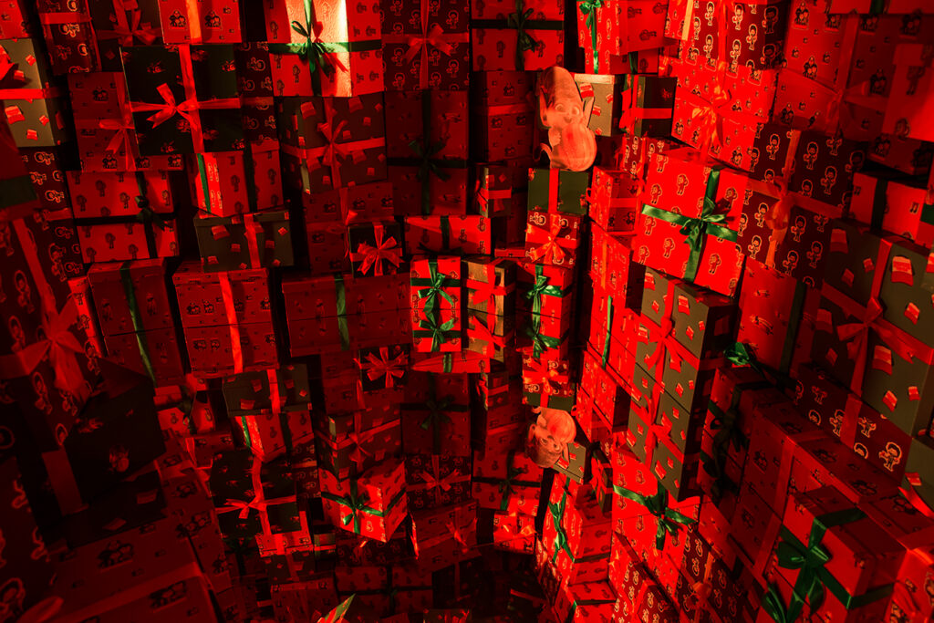 No ambiente externo da casa, o público foi surpreendido com presentes gigantes que estavam embrulhados com papéis que tinham padrões impressos com stickers de outras séries da Netflix. Os padrões dos papéis foram desenvolvidos pelo estúdio, assim como toda a criação e idealização do projeto cenográfico.